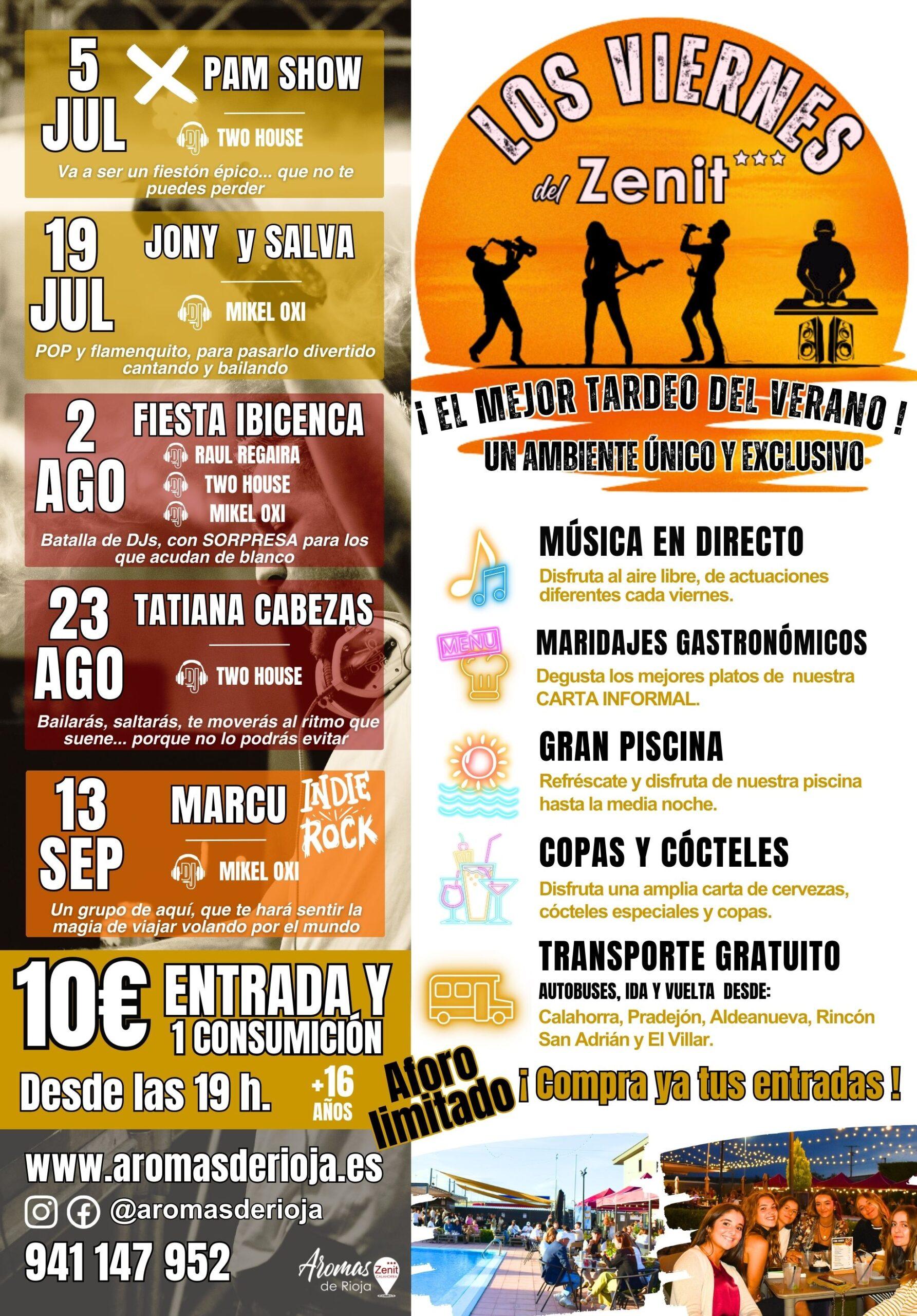 Música en directo con todo tipo de estilos, maridajes gastronómicos con nuestros mejores platos, amplia carta de copas, cervezas y cócteles, junto a nuestra piscina en la que podrás refrescarte hasta la medianoche, y con servicio de transporte gratuito en autobús (ida y vuelta) desde Calahorra, Pradejón, Rincón de Soto, Aldeanueva de Ebro, San Adrián y El Villar de Arnedo hacen de ‘LOS VIERNES DEL ZENIT’ una cita que no te puedes perder este verano para disfrutar con tus amigos.